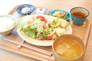 前菜3品にメイン、ご飯、みそ汁つきで栄養バランス◎。